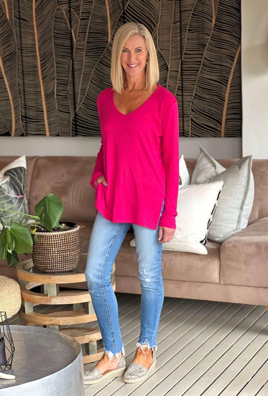 A scooped V-neck jumper in a very soft, 'cashmere-feel' with long sleeves, deep slits in the sides and is slightly longer at the back.Â