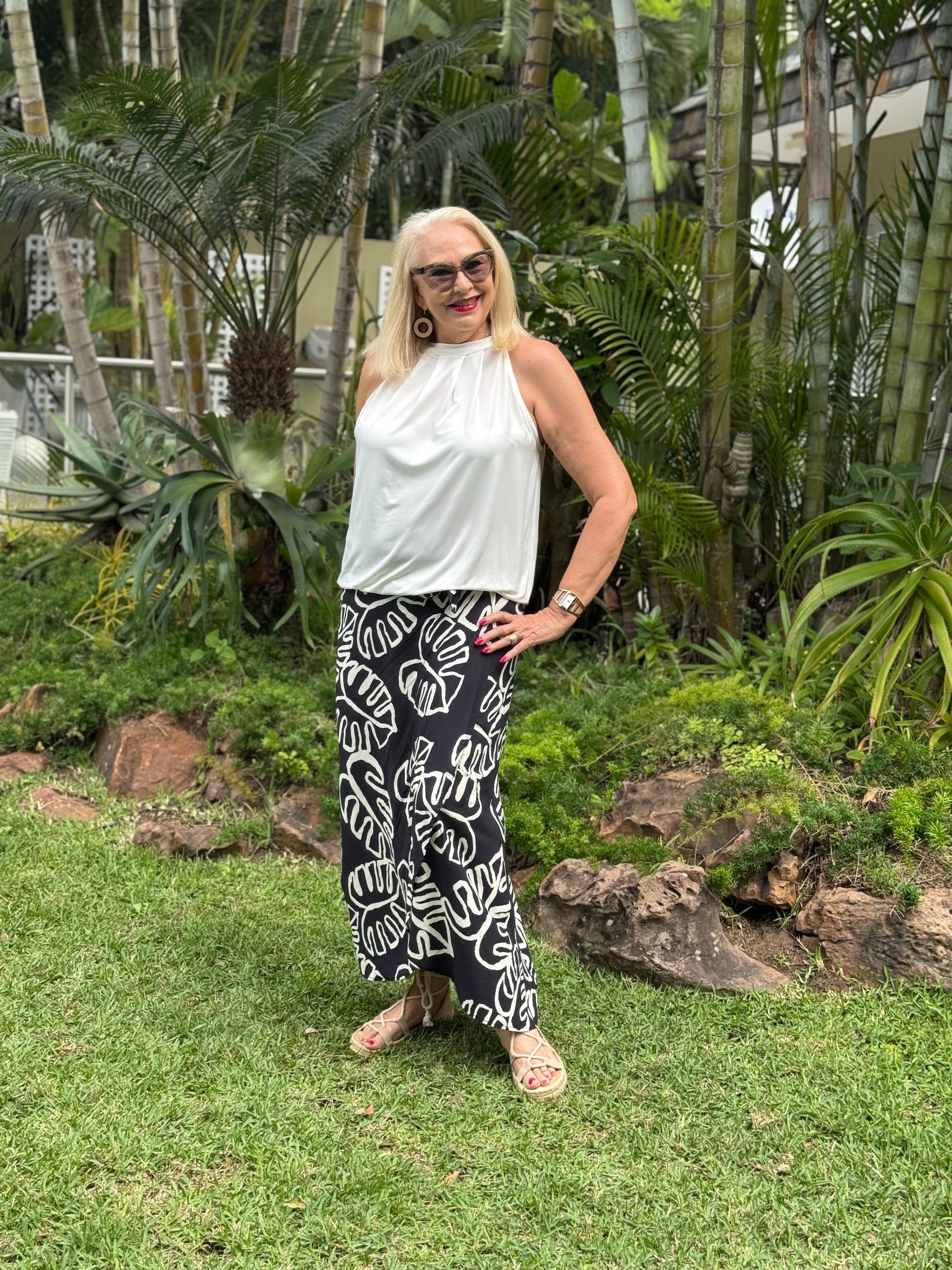 Fabric is a black and white printed viscose / rayon fabric which breathes easily. Pairs perfectly with our black Cara and Donna tops.