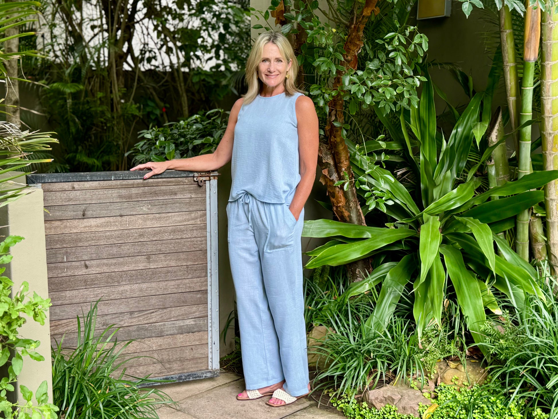 Fabric is a lightweight pale blue linen look, which unlike natural linen resists wrinkling and shrinking and is perfect for travel.