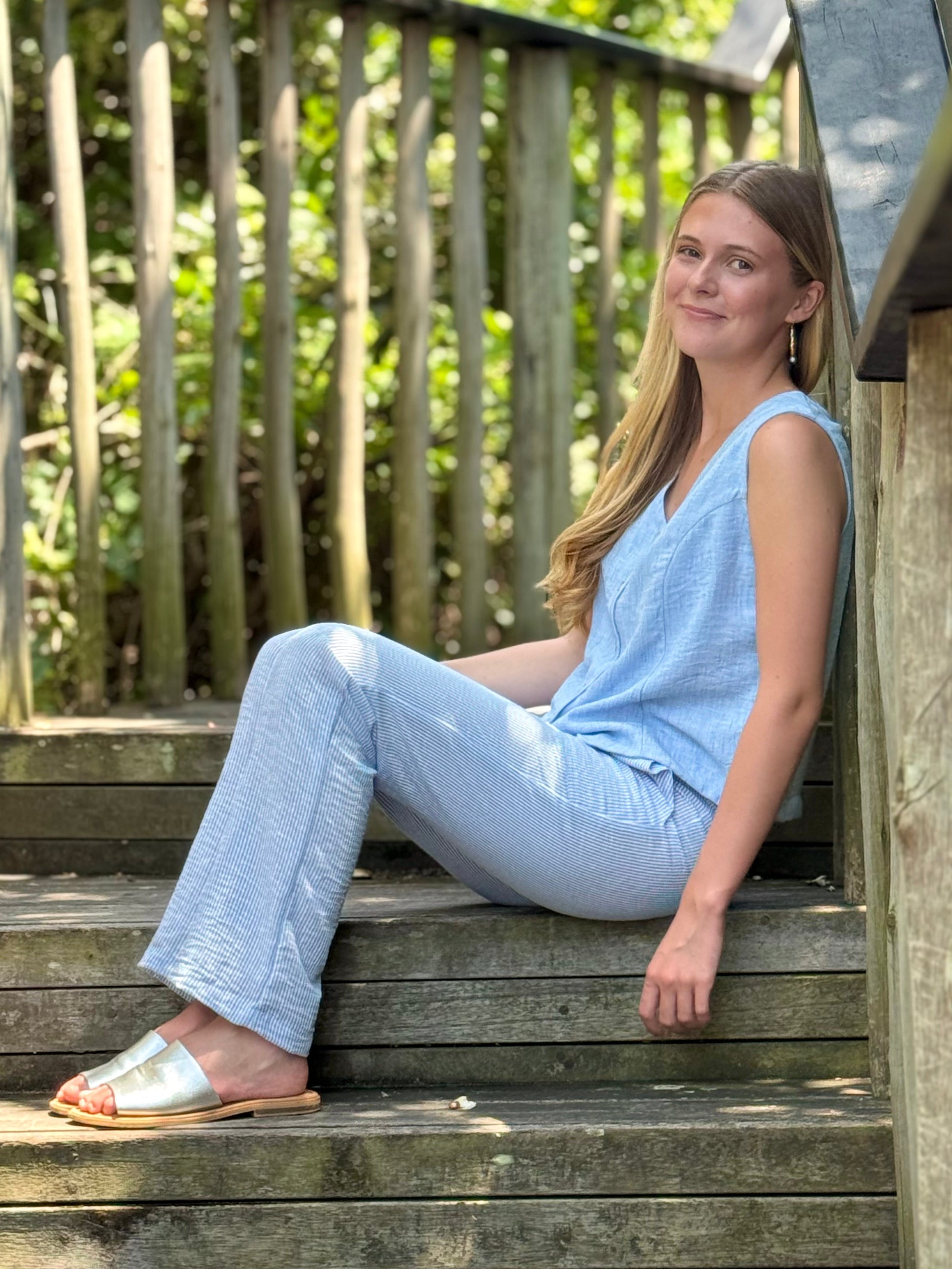Fabric is a soft pale blue and white striped linen look, which unlike natural linen resists wrinkling and shrinking and is perfect for travel.