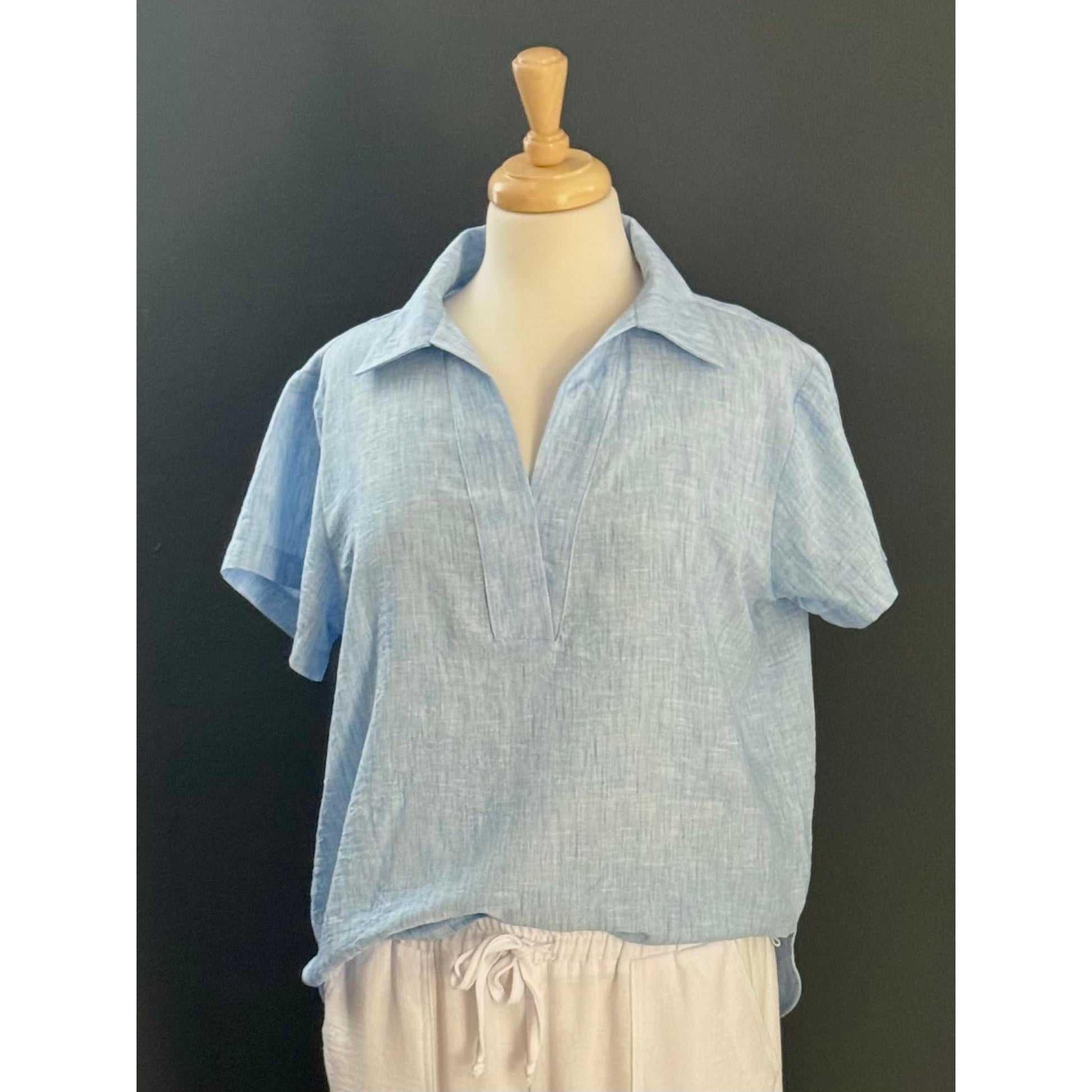 Short sleeves with a neat collar offers a refined yet relaxed look. A gently scooped hem at the front and back for a flattering fit, and easy tucking or layering.